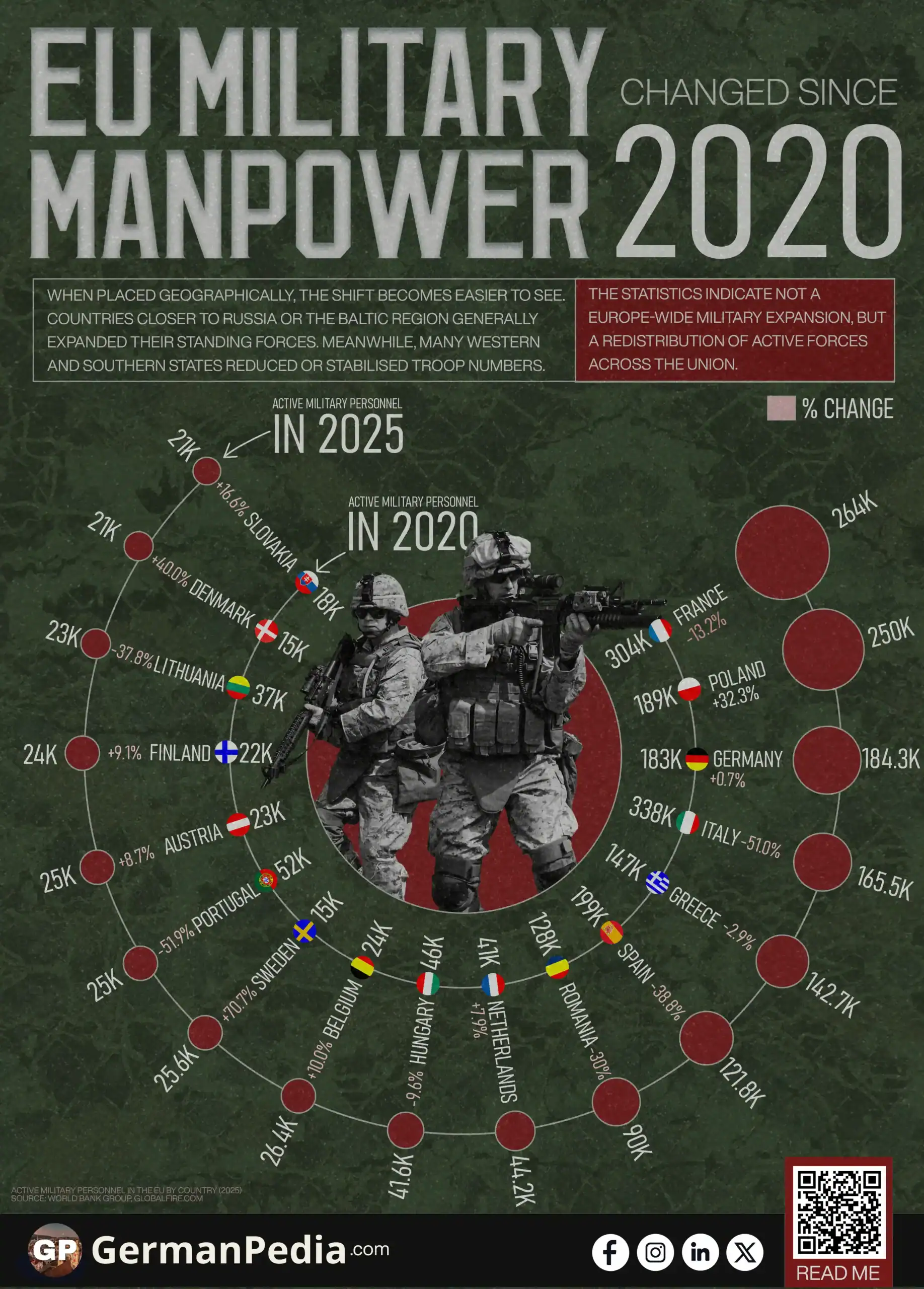 At the same time, the EU did not move in one direction. Several of its largest economies recorded fewer active troops in 2025 than in 2020. This indicates that the shift is regional rather than collective.