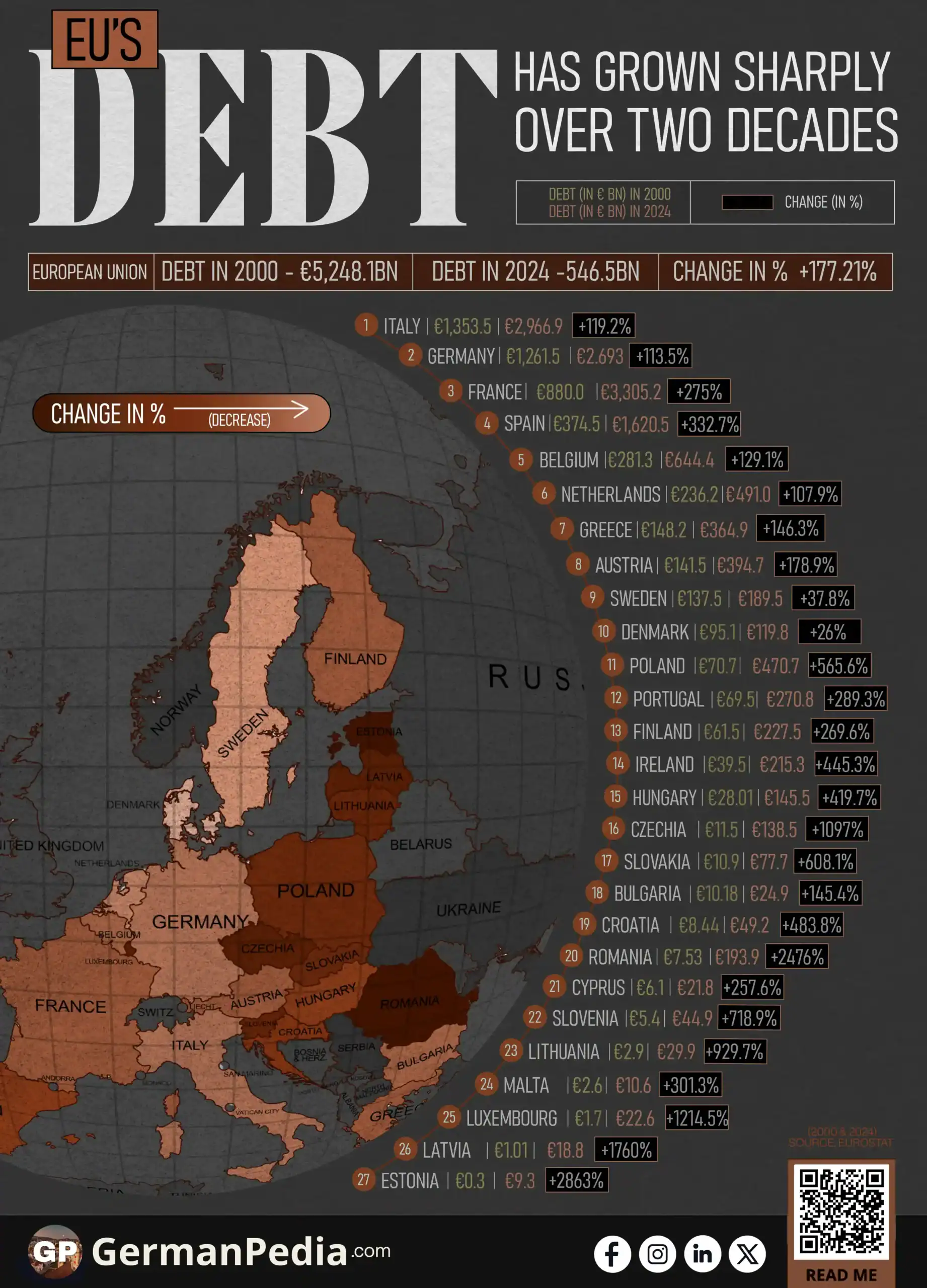 - Germany more than doubled its debt, reaching about €2.7 trillion in 2024.