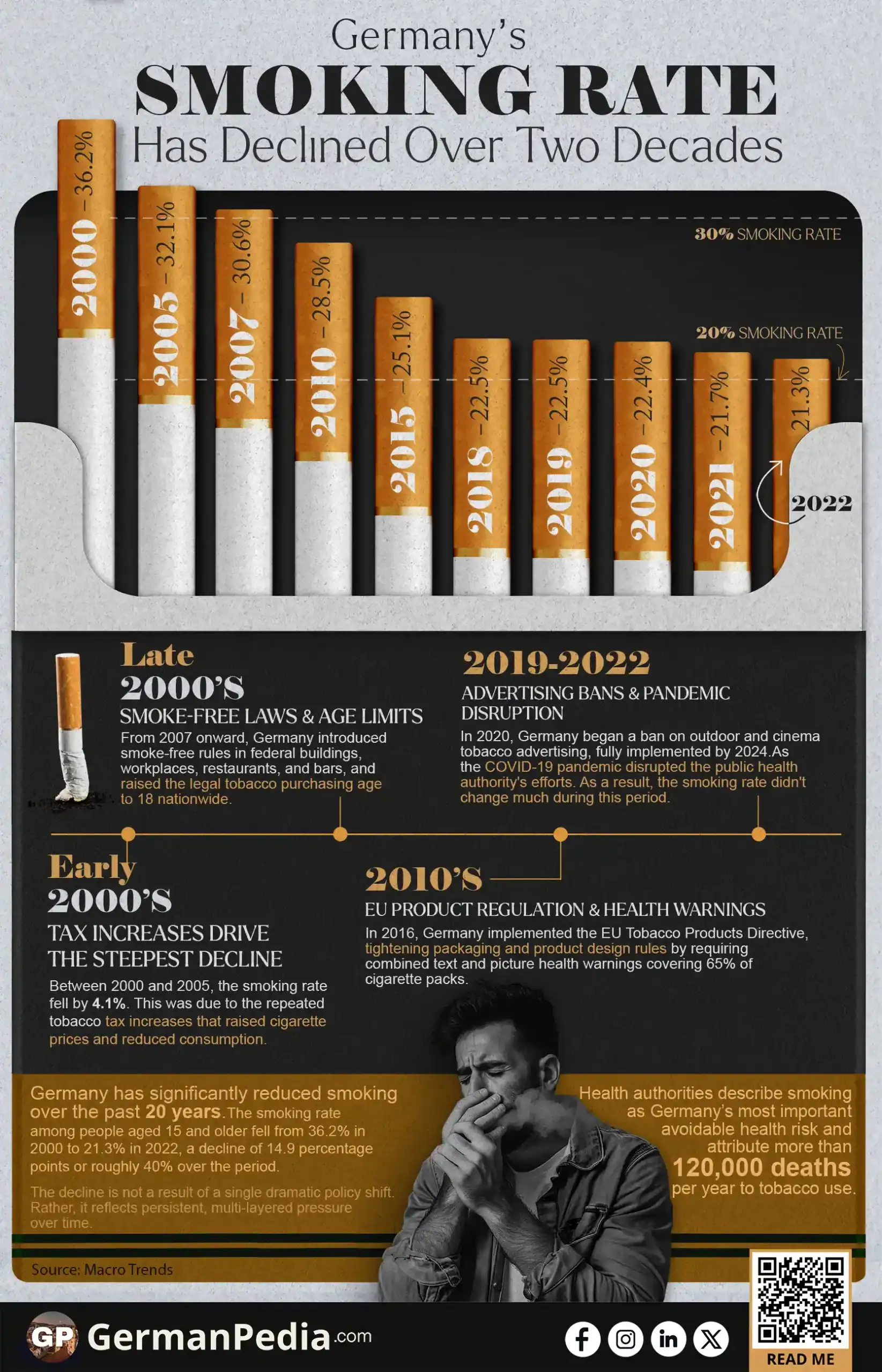 - Germany’s smoking rate fell from 36.2% in 2000 to 21.3% in 2022, a drop of 14.9 percentage points or about 40%.