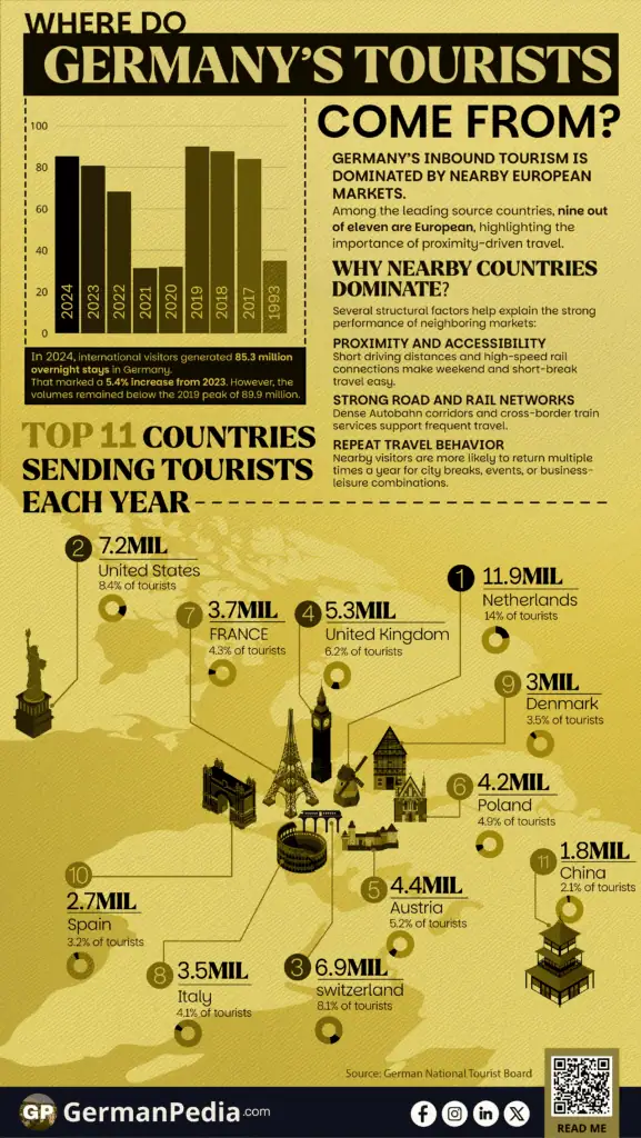 - The Netherlands is Germany’s largest source market, contributing about 14% of all international overnight stays in 2024.