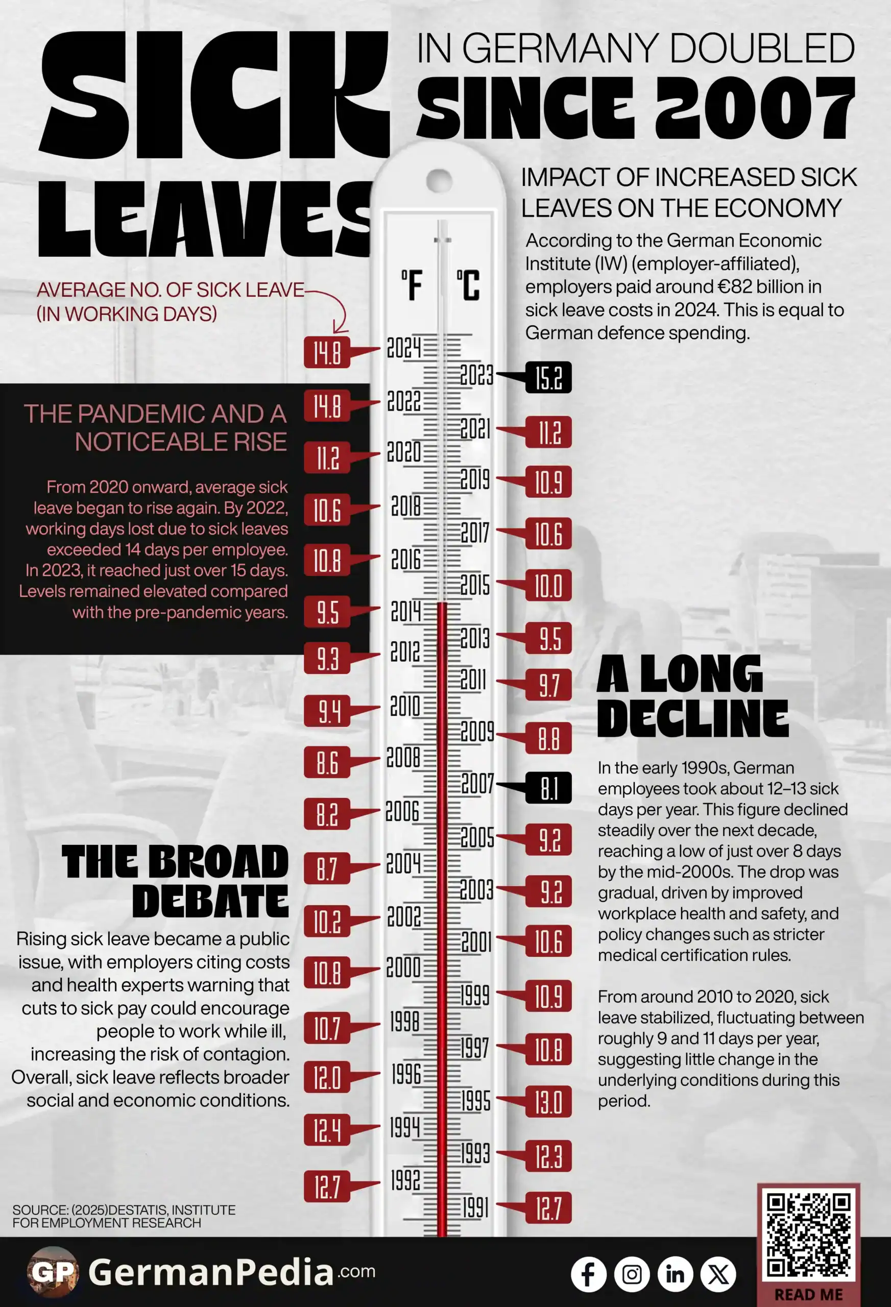 - The pandemic years heightened health risks and prevention measures, leading to an increase in sick leaves. The number peaked at 15.2 days in 2023.