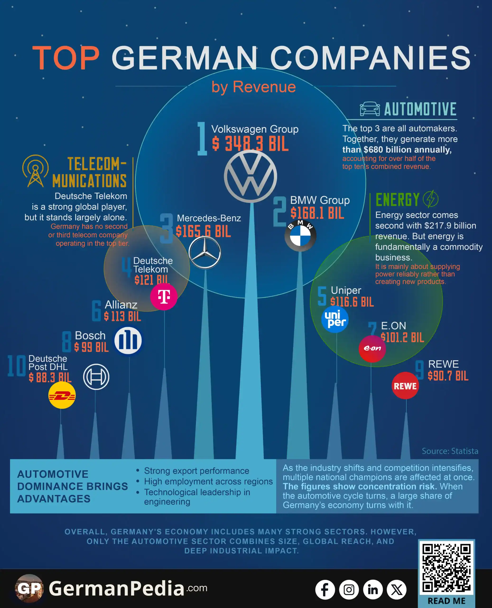 Among Germany’s top 10 companies by revenue, the top three are all automakers. Together, they generate more than $680 billion annually, accounting for over half of the top ten’s combined revenue.