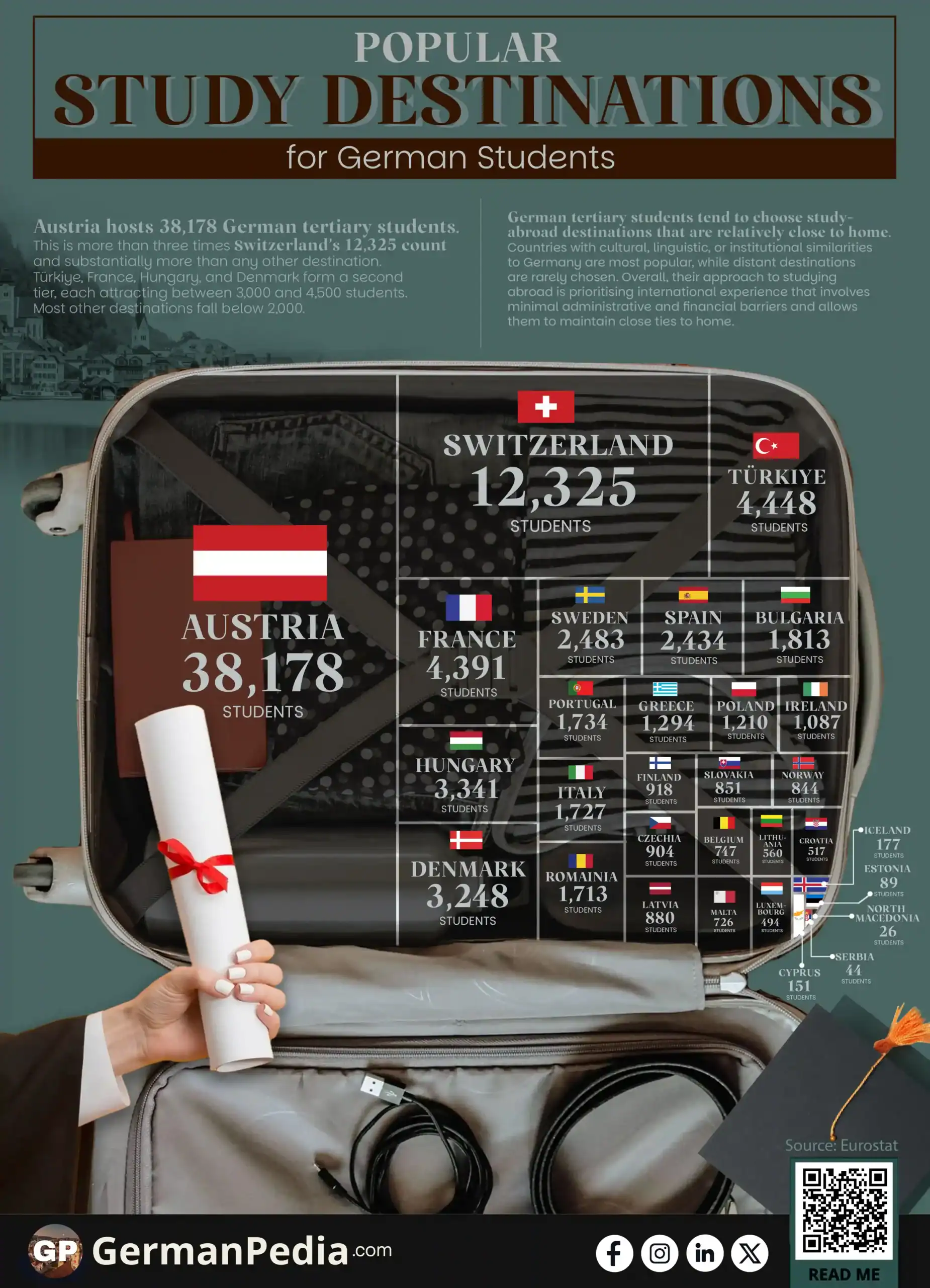 - Austria is the leading study destination, hosting 38,178 German tertiary students, which is more than all other listed countries combined.