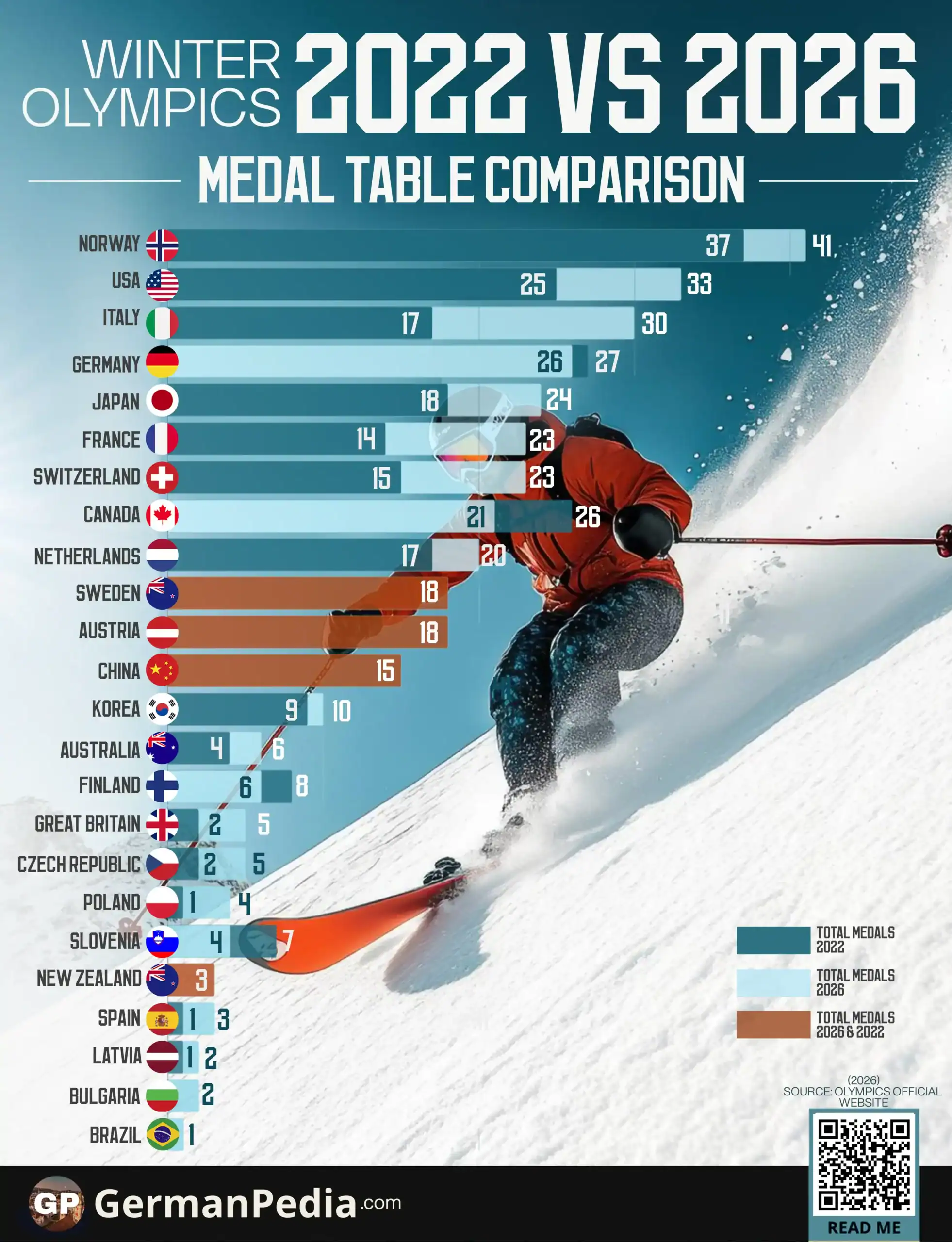 - Germany slipped from second to fifth in gold medals, but it stayed firmly among the winter elite at fifth place in 2026.